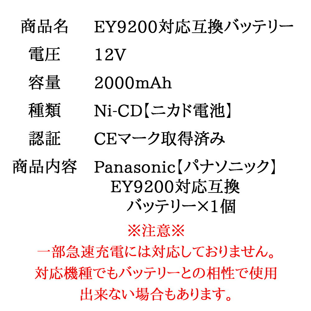 ■商品詳細 型番:対応バッテリー EY9200 電圧: 12V 容量: 2000mAh 種類: Ni-CD 【ニカド電池】 認証: CEマーク取得済 商品内容 : PANASONIC(パナソニック)EY9200 対応互換バッテリー 1個 ※注意※ ・一部急速充電器には対応しておりません。