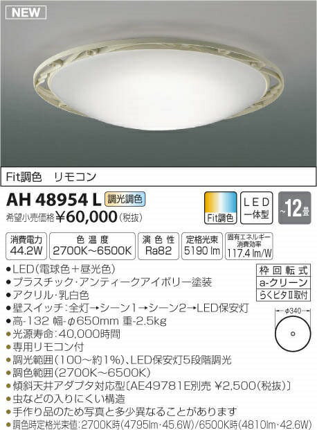 【最大44倍スーパーセール】コイズミ照明 AH48954L LEDシーリング LED一体型 Fit調色 調光調色 電球色+昼光色 リモコン付 〜12畳 アンティークアイボリー