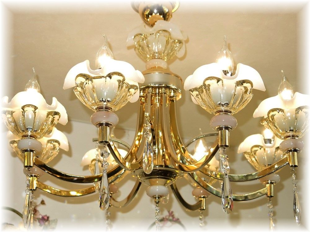 添付画像では肉眼で見る本来のクリスタルの輝きをご確認いただけませんが、8灯の電球が上質クリスタル水晶を通し光の屈折で光の持つ本来のカラーをかもし出しダイヤモンドのように輝きながらワット数以上の明るさでお部屋を照らします♪