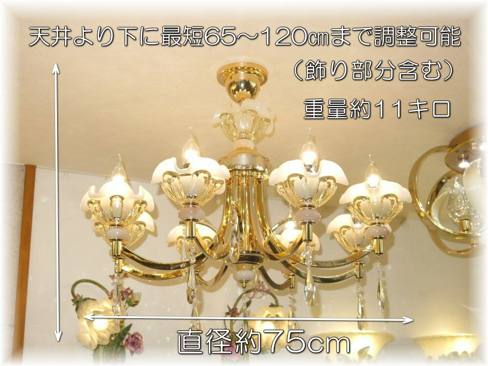 キャンドル8灯 豪華 シンプルデザイン クリスタルシャンデリアを是非この機会に! サイズ 高さ最短65cm〜最長120cm(飾り含む)まで調整可能 直径約75cm 重量約11キロです 120cm以上ご希望の場合はご注文後お申し付け下さい 送料 ■送料無料(沖縄・北海道別途¥1300-) ご注意 新品・未使用品での販売ですが製造上での多少の小傷等はご了承願います 取り付けに関しましてはワンタッチでは御座いませんが(配線はワンタッチ)引掛けシーリングに対応しております、取り付け説明を参考に組み立て・結線して下さい、ご心配の場合は安全を期して最寄の電気工事店にご依頼をお勧めいたします また取り付け方等事前にお知りになりたい方はお気軽に質問コーナー又はfirst@kuk.ne.jpにお問い合わせお願い致します 調光が必要の場合、調光対応LED1個別途¥200-と汎用調光器が必要です 店頭販売もしており重複した場合キャンセルさせていただく場合がございますがあらかじめご了承願いますキャンドル8灯クリスタルシャンデリア ☆