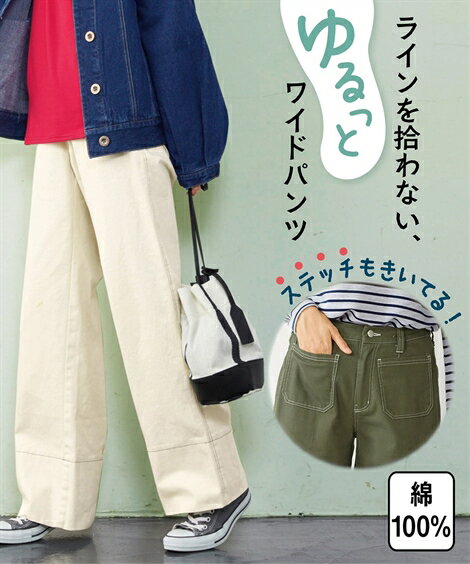パンツ ワイド ガウチョ 大きいサイズ レディース 綿100% ステッチワーク ワイド ゆったりヒップ アイボリー/カーキ 73/76/80 ニッセン